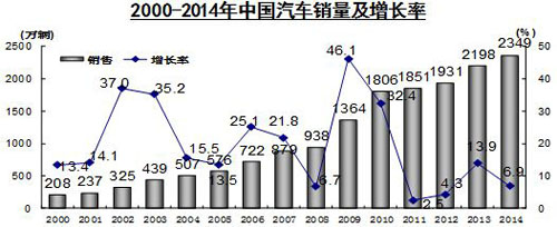 统计显示,2014年我国汽车产销2372.29万辆和2349.19万辆,同比增长7.26%和6.86%;其中,乘用车产销1991.98万辆和1970.06万辆,同比增长10.15%和9.89%;商用车产销380.31万辆和379.13万辆,同比下降5.69%和6.53%。
