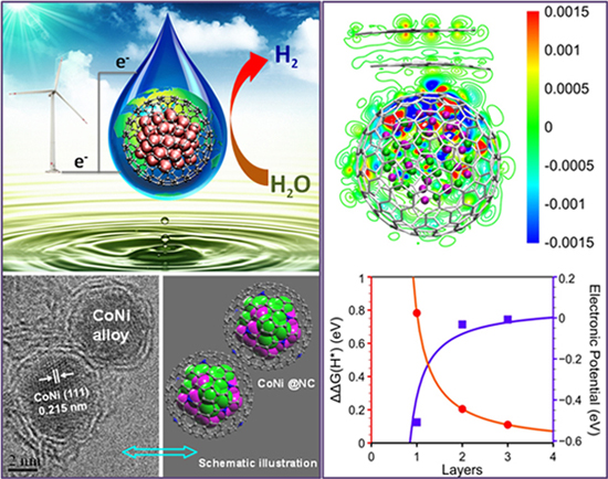 近日,中国科学院大连化学物理研究所催化基础国家重点实验室副研究员邓德会和中科院院士包信和带领的研究团队在长期深入研究纳米碳材料催化的基础上,通过创新二维纳米碳材料(类石墨烯材料)的制备策略和合成方法,成功实现了均一的超薄石墨烯壳层(一般为1-3碳层)对3d过渡金属纳米粒子的包裹和封装。理论模拟和实验研究表明,在催化反应过程中,活性金属纳米粒子催化剂在纳米碳空腔中的封装阻断了其与苛刻反应环境(如酸性、碱性和强氧化性等)的直接接触,有效地延缓和阻止了催化剂的失活,同时,被包裹的纳米金属的活性价电子通过与类石墨烯碳层的相互作用“穿透(penetration)”到外表面,实现了高效催化反应。基于这一原理制备得到的石墨烯碳层封装的纳米钴-镍催化剂应用于强酸性条件下电解水制氢反应(HER),表现出了优异的催化活性和稳定性,在电流密度为10 mA/cm2 的条件下,电解水阴极过电位仅为142 mV,性能接近于通常采用的40%Pt/C催化剂,相关结果于近日在《德国应用化学》(Angew. Chem. Int. Ed., 2015, DOI: 10.1002/anie.201409524)在线发表,并被该期刊选为“热点文章(Hot Paper)”。