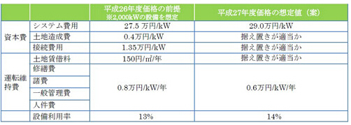 2014年度的采购价格前提和作为2015年度价格设想值的非住宅用光伏发电的成本数据