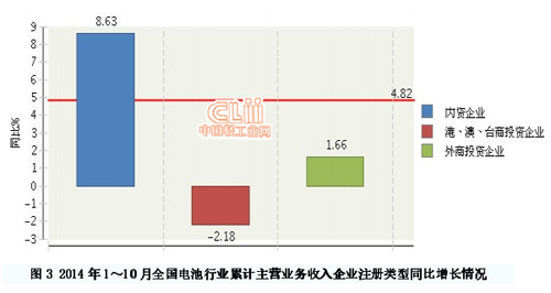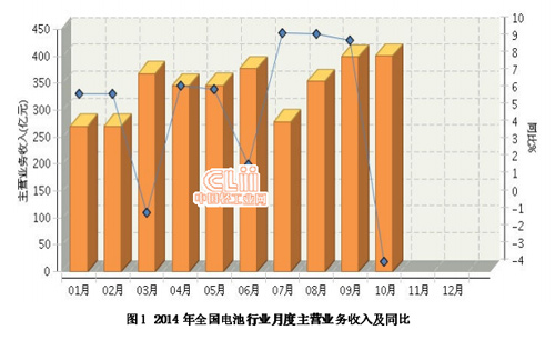 2014年1-10月,全国电池行业累计完成主营业务收入同比增长4.82%。其中:10月份完成主营业务收入同比增长-3.41%。(参见图1)