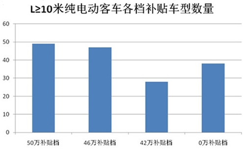 在前三批入选免购置税目录的224款纯电动客车中,车长为6米≤L<8米这一档,满足Ekg<0.5的车型有40款,每台车能够拿到该类别30万的最高标准补贴,满足0.5≤Ekg<0.6的车型有4款,能够拿到26万的补贴,而满足0.6≤Ekg<0.7的车型有2款,能够拿到22万的补贴,另外还有6款车单位载质量能耗量超过0.7,则拿不到国家补贴;车长为8米≤L<10米这一档,满足Ekg<0.3的车型有7款,每台车能够享受该类别40万的最高标准补贴,满足0.3≤Ekg<0.4的车型有2款,能够拿到36万的补贴;而车长为L≥10米这一档,满足Ekg<0.3的车型有49款,每台车能够享受该类别50万的最高标准补贴,满足0.3≤Ekg<0.4的车型有47款,能够拿到46万的补贴,而满足0.4≤Ekg<0.5的车型有28款,能够拿到42万的补贴,另外还有38款车单位载质量能耗量超过0.5,拿不到国家补贴。