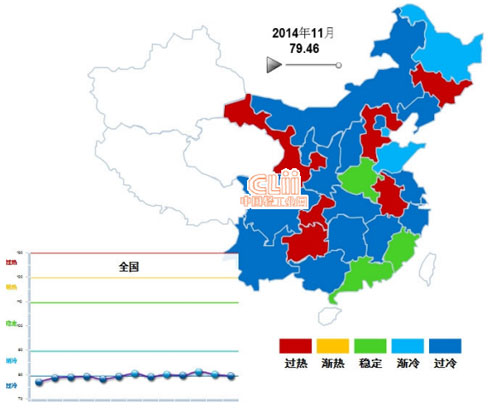 2014年11月中轻电池景气指数再入“过冷”提示区,电池景气指数为79.46,较10月的80.09有所下降。