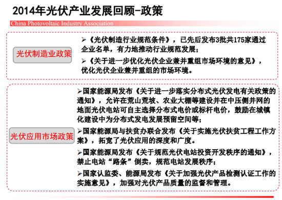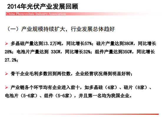 [摘要]近期,中国光伏行业协会秘书长王勃华在“光伏行业发展与投资分析——2014年回顾与2015年展望”研讨会上总结了去年我国光伏制造端以及应用市场的整体情况。
