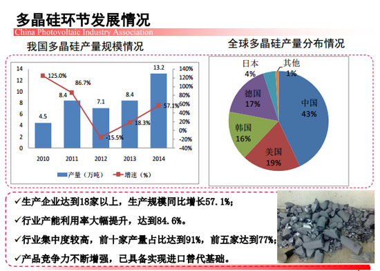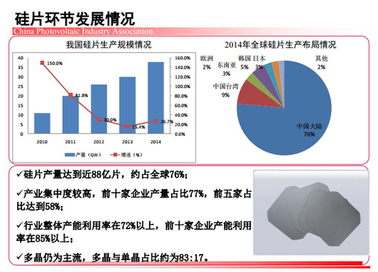 近期,中国光伏行业协会秘书长王勃华在“光伏行业发展与投资分析——2014年回顾与2015年展望”研讨会上总结了去年我国光伏制造端以及应用市场的整体情况。