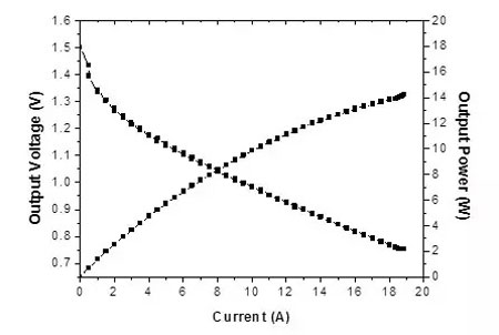 中国科学院宁波材料技术与工程研究所动力锂电池工程实验室在优化阴极空气扩散电极的结构与制备工艺,以及开发高性能的锰氧化物氧还原催化剂的基础上,成功研制出1000Wh镁空气电池样机,详见图1所示。该电池由5个单体电池串联而成,以AZ31镁合金为阳极,以10%的NaCl溶液为电解液,以上述空气扩散电极和锰氧化物催化剂为阴极。该镁空气电池的外观尺寸为200×150×150 mm3,重量为2.3 kg,能量密度可达430 Wh/kg,最大输出功率可达80W,其单体电池的I-V曲线如图2所示。上述镁空气电池具有较好的商业化前景,可应用为野外供电电源、移动电源、备用电源和应急电源等。