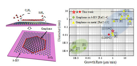 气相催化法生长石墨烯单晶的示意图(左)和所得单晶尺寸和生长速率与之前文献报道数据比较(右)