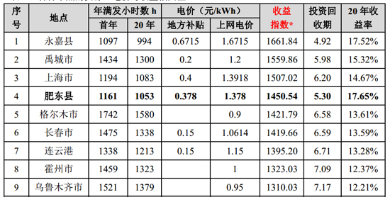 2)收益最好的不是太阳能资源最好的格尔木,也不是电价补贴最高的永嘉县,而是高补贴、资源也不太差的肥东县。因此,单纯的从太阳能资源或者上网电价来判断一个地区的户用光伏系统的可投资性,都是不全面的。