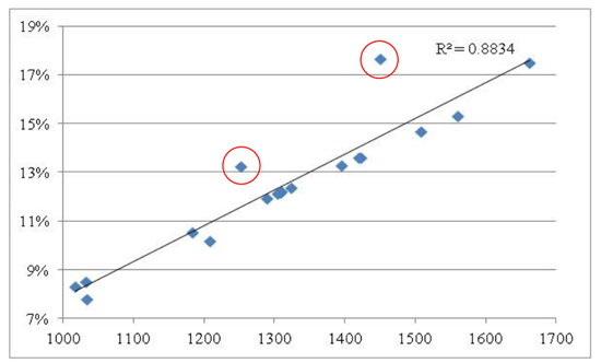 图 3 不考虑初始投资补贴样本点收益指数与收益率的相关性示意图