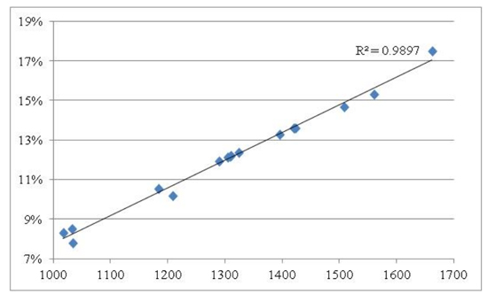 在前文的一系列收益率计算前提条件的基础上,当收益指数为1015 时,收益率为 8%;当收益指数为 1158 时,收益率为 10%;当收益指数为 1301 时,收益率为 12%。