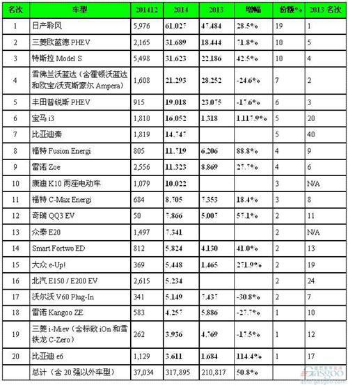 数据显示,包括最畅销前二十强车型在内,2014年12月全球电动车销量达到37034辆,全年累计销量则为317895辆,对比2013年的210817辆,同比大涨50.8%。中国、美国和欧洲几大主要电动车市场都呈现销量上行趋势。此处电动车包括纯电动车和插电式混合动力车,但未计入中国和印度的低速电动车。