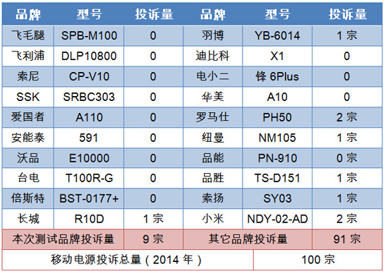 深圳市消委会针对2014年下半年第四季度电商平台热卖的20个品牌的20款移动电源产品进行了比较试验,20款移动电源经受短路保护、过充电保护和自由跌落测试,未出现泄露、漏气、破裂、起火和爆炸的情况,且在短路、过充电状态接触后能正常工作。