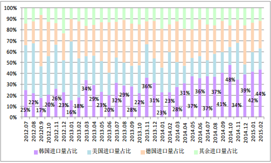 一、对于韩国最大多晶硅生产企业OCI征收2.4%的反倾销税对其根本不造成任何影响,故韩国向中国出口多晶硅无论按照一般贸易方式还是加工贸易方式都毫无顾忌,2月份从韩国进口多晶硅量达到3286吨,占当月总进口量的43.5%,依旧位居进口量首位,并遥遥领先于位居第二位的德国。因此,自韩国进口日渐猖狂是导致进口量很难大幅下降的主要原因。