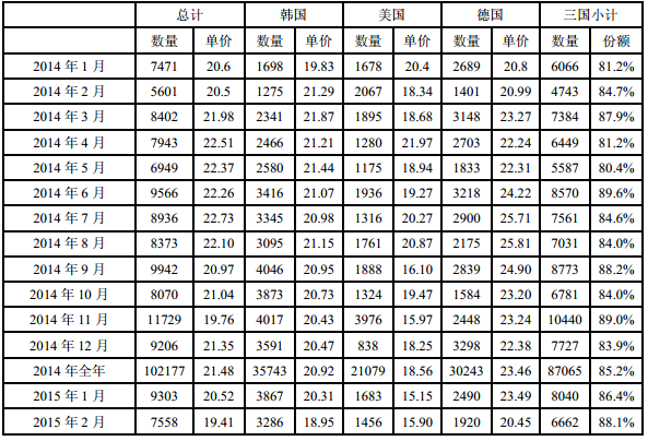 表1 2014年-2015年我国多晶硅进口情况(单位:吨、美元/千克)