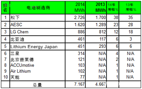 2014年,全球电动汽车锂离子电池产能井喷,高达7000 MWh的产量年比增长约54%,EV Sales Blog根据电动汽车的销售数据和不同插电式汽车的千瓦时利用模型,计算得出全球十大电池生产商的排名,来自中国的比亚迪、北京普莱德、中航锂电和天能四家厂商赫然在目,进步非常迅速。