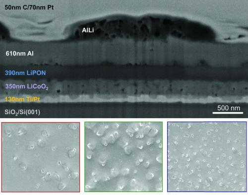 注:(顶部)铝阳极全固态薄膜电池在循环之前的一个截面的扫描电子显微镜图像。(底部)自上而下的扫描电子显微镜图片显示了在第一阶段的循环过程中,铝阳极表面的行为。通过增加充电电流,集群的密度同样也会增加(红色显示的是充电50分钟后呈现10 nanompas的效果,绿色是充电17分钟后呈现20 nanoamps的效果,蓝色是充电3分钟后呈现30 nanoamps 的效果),表明铝锂合金的形成是一个动力驱动的过程。