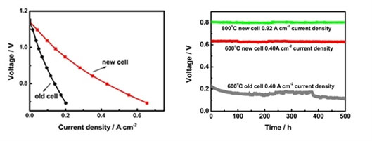 该团队研制出了LSM-YSZ微纳阴极电池,电池输出性能是传统LSM-YSZ阴极电池的2至3倍,并且在600℃至800℃下运行稳定。在LSM-YSZ微纳阴极中,纳米级LSM颗粒和YSZ颗粒的紧密接触增加了三相反应界面密度,大幅度地提高了阴极的氧还原活性。同时,纳米级LSM颗粒与纳米级YSZ颗粒的界面稳定提高了阴极在运行条件下的稳定性。