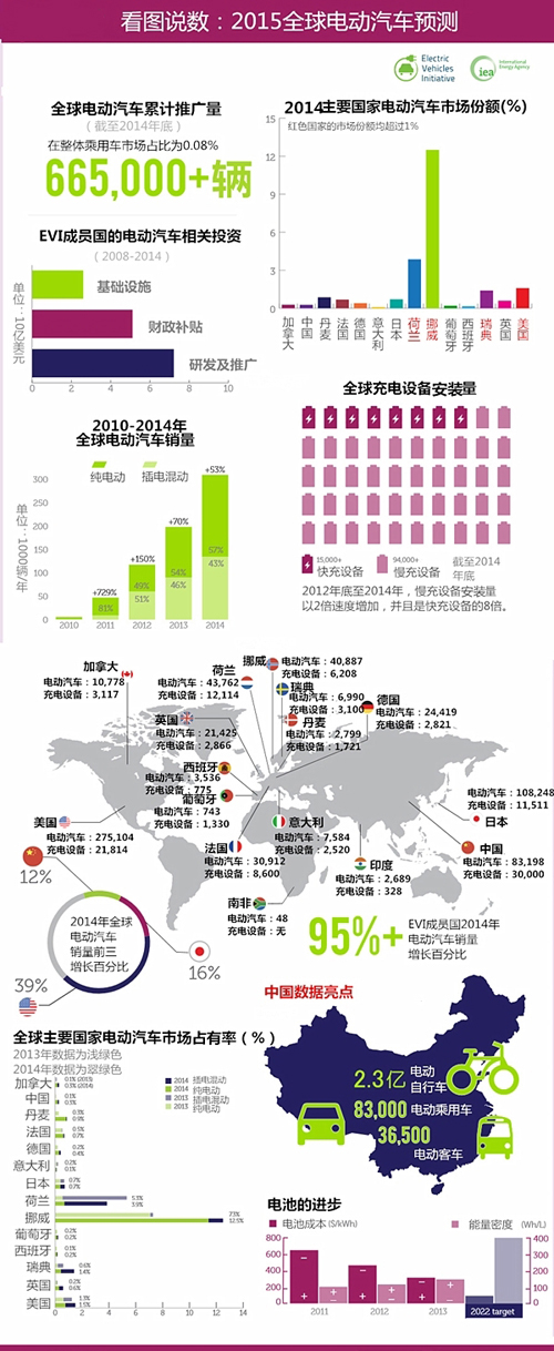 清洁能源部长会议(Clean Energy Ministerial)下属的电动汽车倡议( Electric Vehicles Initiative,简称:EVI)近日发布《2015年全球电动汽车及充电基础设施展望》,本文将重要数据提炼成一张图表,帮助读者对包含中国在内的全球主要国家的电动汽车发展有一个一目了然的判断。