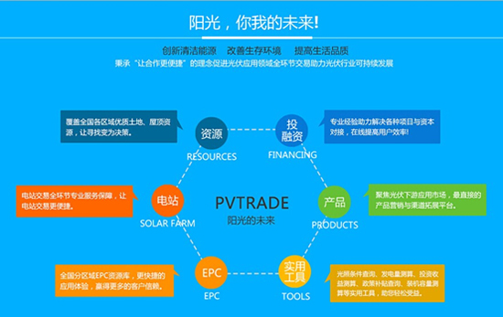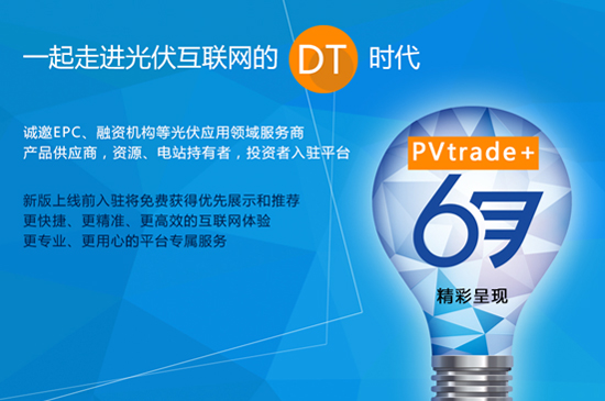 PVtrade光伏交易网于2014年试运营,现已成为国内领先的光伏行业综合服务平台。2015 年PVtrade平台将进行全面升级,升级后的PVtrade契合当下最流行的“互联网+“这一理念,用互联网思维来改变光伏交易各方面临的痛点。