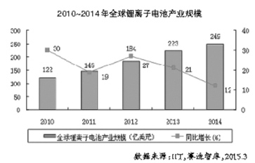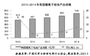 2014年我国锂离子电池产业规模达到715亿元,同比增长15%,增幅比2013年提高6个百分点,增速进一步回暖。受消费电子产品市场增速趋缓以及电动汽车迅猛发展影响,我国锂离子电池产业发展呈现出“一快一慢”新常态,即动力型锂离子电池需求快速增长,消费型锂离子电池市场增速明显放缓。2014年我国锂离子电池产业发展呈现以下特征:一是国家高度关注,电动汽车迎来春天;二是政府职能转变,发展环境不断优化;三是布局速度加快,锂离子电池企业忙转型;四是资本市场活跃,产业整合势头凸显。
