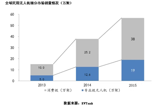 关于中国市场的无人机市场,EVTank在该研究报告中指出,中国2014年无人机销量约2万架,其中军用无人机约占1.4%,民用无人机占98.6%,预计到2020年中国无人机年销量将达到29万架。EVTank分析认为,受低空逐步开放的利好,国内民用无人机发展非常迅猛,未来几年将保持50%以上的增长,2014年中国民用无人机销售规模已经达到40亿元。