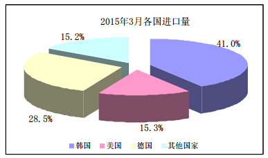 据3月份分国别进口数据显示,自韩国、美国、德国三国共进口多晶硅8733吨,占总进口量的84.8%,其中从韩国进口量为4224吨,占总进口量的41.0%;从美国进口量为1572吨,占总进口量的15.3%;从德国进口量为2938吨,占总进口量的28.5%;其他地区进口量为1563吨,占总量的15.2%。