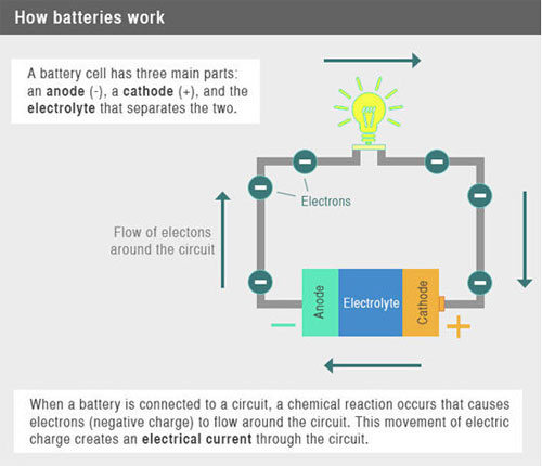 标准的电池构造是将两块化学势不同的金属或是化合物用一层多孔绝缘体隔开。化学势即是储存于原子与化学键之间的能量,当电子能够自由地在连接的外部设备中移动的时候,这些能量能够传递给那些运动的电子。