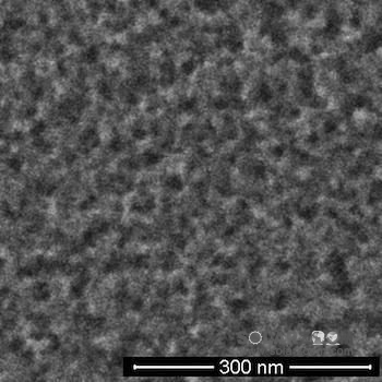 电子显微镜影像显示在用于太阳能电池的芯片表面上快速制作出可吸收光线的精细突起与孔隙。莱斯大学研究人员开发出在黑硅工艺中兼负双重任务的金电极——作为催化剂加速表面蚀刻。