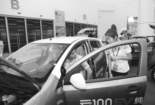 昨日上午,几辆红、白、蓝色的纯电动车被参观者团团围住,很多人最先是被这些车靓丽的外形所吸引,而当看到挂在车“屁股”上的充电线后,更令人感到惊讶,充电线的一端竟然是一根三相插头。