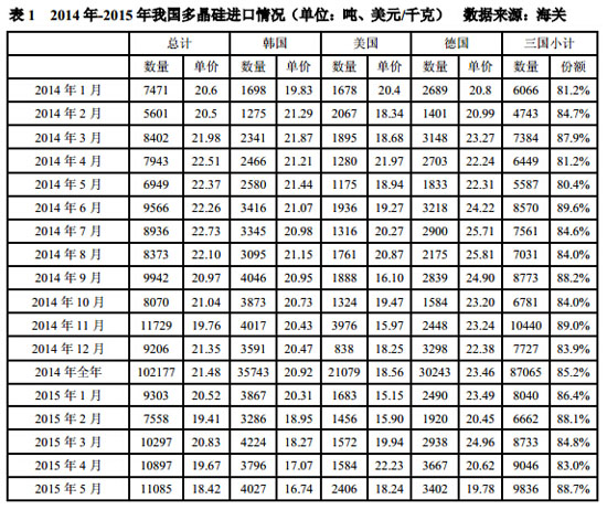 2015年5月份从美国进口多晶硅量大幅增加至2406吨,环比增幅为51.9%;5月份进口单价下滑至18.24美元/千克,环比降幅为17.9%。