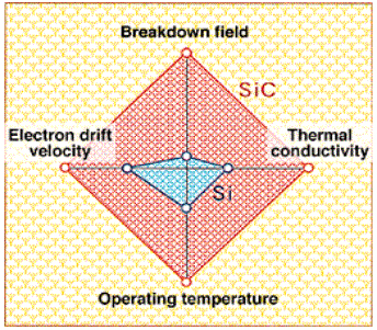 碳化硅物理特性与硅有很大不同。单晶碳化硅比单晶硅具有很多优越的物理特性,例如大约10倍的电场强度、大约高3倍的热导率、大约宽3倍禁带宽度、大约高一倍的饱和漂移速度。除此之外,在具体的应用上,虽然碳化硅器件的工艺难度比单晶硅大很多,但是一旦解决工艺问题,碳化硅器件制造流程短,体积重量小、抗氧化寿命长、输出功率高的特点,将使其成为远优于单晶硅的21世纪理想半导体材料。而且碳化硅材料对电力的能耗极低,按照如果年产40万片碳化硅晶片衬底的计划,仅仅应用在照明领域,每年减耗的电能就相当于节约2600万吨标准煤,是一种理想的节能材料。