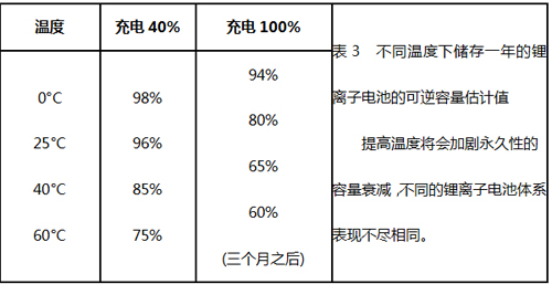 受热或高充电电压下也会使锂离子电池承受更大的负担,30℃(86°F)对于大多数锂离子电池来说已经算是较高温度了,4.10V/电池以上的电压为高电压。将充满电的电池暴露在高温下较长时间比电池循环次数增加对锂离子的压力还要大。表3表示了容量损失与温度的函数关系。