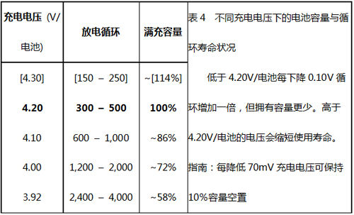 对于循环寿命来说,锂离子电池的最佳充电电压为3.92V。电池专家们相信这个临界值消除了所有与电压相关的不利影响,当低于该值时,可能会给电池带来其他的不利影响。表4总结了不同充电水平下的电池容量状况,所有数值均是估值。