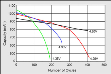 大多数的锂离子充电到4.20V,每当充电的截止电压降低0.1V时,电池的循环寿命将会扩大一倍。例如,锂离子电池充电到4.2V时,通常可以循环300–500次;如果充电截止电压设为4.10V,寿命可延长至600–1000次循环;设置为4.00V充电制度下可以实现1200–2000次循环;对于3.90V,可以达到2400–4000次循环。