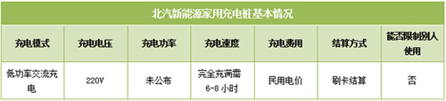 购买北汽新能源车型可随车赠送一个慢充桩,该充电桩使用的是220V电压,充满一辆车需要6-8小时。晚上充电白天使用,大多数情况不会耽误车主用车。充电费用方面,采用的是民用电价,结算方式为每次刷专用电卡结算。