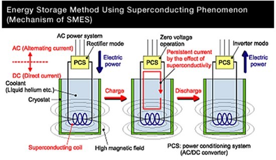 超导储能系统是由一个用超导材料制成的、放在一个低温容器(cryogenic vessel) (杜瓦Dewar )中的线圈、功率调节系统(PCS)和低温制冷系统等组成。能量以超导线圈中循环流动的直流电流方式储存在磁场中。