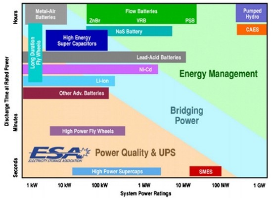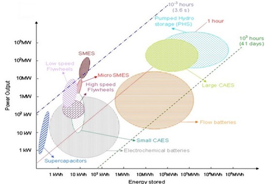 不同储能技术的储能容量能量和放电时间的比较示于图,可以看出不同的储能技术处于图中不同的位置。