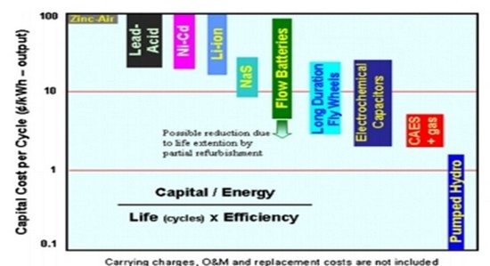 投资成本是一个重要的经济参数,影响能源生产的总成本。每个循环的成本可能是评估能量存储系统成本的最佳方式。下图给出投资的主要组分,考虑到耐用性和效率。