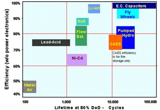 储能的效率和寿命(循环的最大数)是两个重要参数,因为它们影响到存储的成本。下图给出不同存储技术相对于效率和寿命的特点。