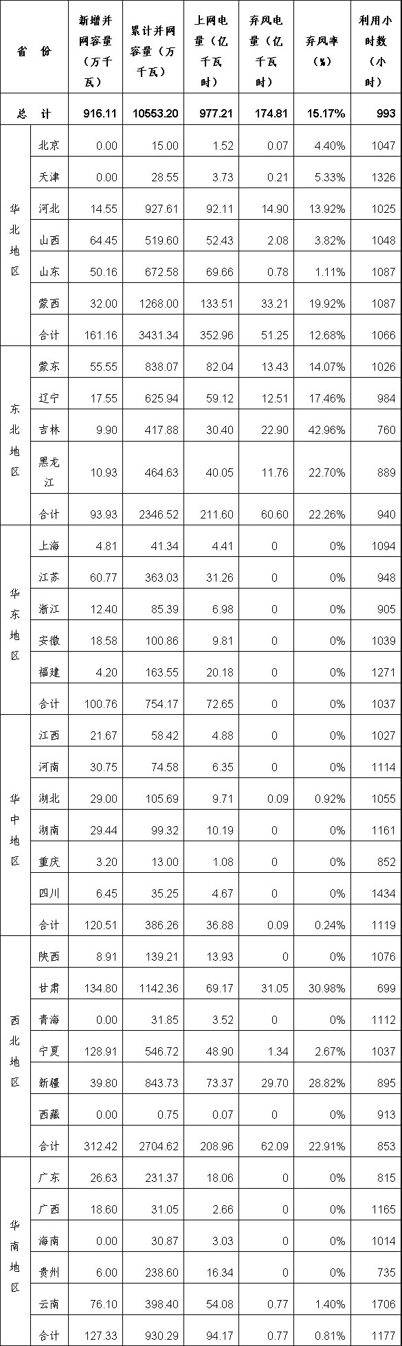 2015年上半年风电并网运行情况统计表