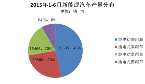 从车型分布来看,纯电动乘用车仍是整个新能源汽车市场的主力车型,2015年上半年生产36355辆,占总体产量的45%。其次是插电式乘用车生产20366辆,占比26%。新能源乘用车整体占比由去年的65%提升了7个百分点,私人市场进一步扩大。