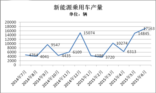 5月、6月的产量再次稳固了对新能源乘用车市场的信心。5月生产14845辆,环比增长135%;6月生产17163辆,环比增长15.6%。至此,新能源乘用车2015年1-6月累计生产5.67万辆,已超过去年全年5.45万辆的产量。