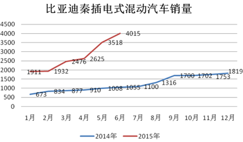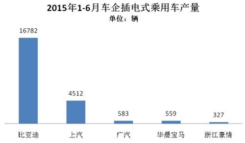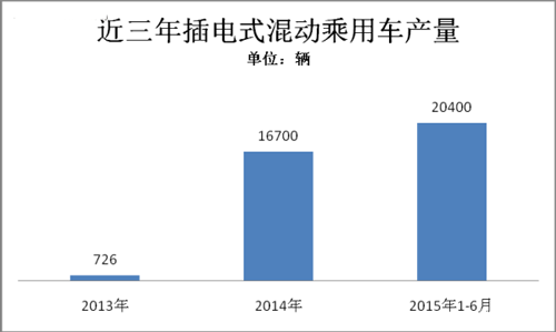 2015年1-6月,插电式混合动力乘用车生产2.04万辆,同比增长4倍。插电式乘用车在所有新能源车型中增长速度最快。