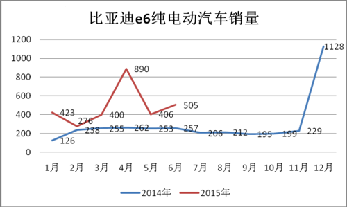 纯电动汽车e6主要定位出租车市场,4月因中标武汉纯电动出租车项目冲高,5月回落到406辆,6月又上500辆。除了2月受春节假期的影响外,e6电动车每月的销量都保持在400辆左右,市场销售相对稳定,1-6月累计销售2900辆。e6也推出了新版车型,新e6今年2月登入节能与新能源汽车目录,该车换装了磷酸铁锰锂电池,能量密度进一步提升,续航也得到扩展,新版e6将继续主打出租车市场。