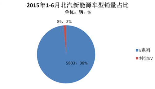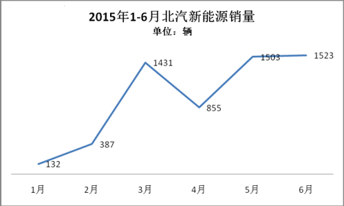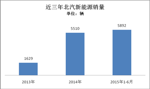根据乘联会数据统计,北汽新能源2015年1-6月累计销售新能源乘用车5892辆。北汽新能源坚持纯电动技术路线,推出的新能源车型包括E150EV、EV200、EV160、ES210等均为纯电动车型。2014年销量为5510辆,2013年销量为1629辆。