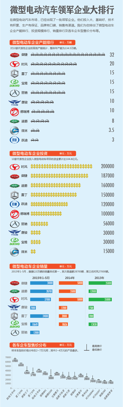 在微型电动汽车市场,已经出现了一批领军企业。他们投入大、基础好、技术有积累、生产有保证、品牌有口碑、销售有渠道。我们为您排出了微型电动车企业产能排行、投资规模排行、销量排行及各车企车型售价分布等。