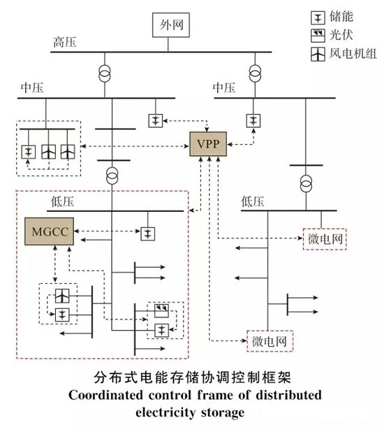 3)广域协调控制。对于在地理位置上分布较广的分布式电能存储系统,无法直接采用微电网模式进行管理和控制,需通过配网调度或者虚拟电厂(VPP)技术。此时的协调控制需涵盖多个微电网以及微电网覆盖范围以外的分布式电能存储系统,进而实现广域协调控制。