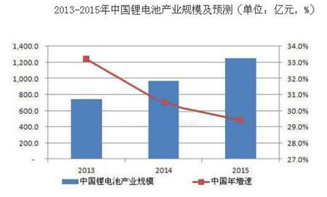 2014年1-12月,我国电池制造业主要产品中,锂离子电池累计完成产量52.9亿自然只,产量与上年持平;其中12月份当月完成产量4.8亿自然只,同比下降12.3%。全球新能源汽车产业将在技术不断成熟、政府扶持政策不断落地的大背景下呈现出快速产业化的趋势,另外,电动工具、电动自行车、新能源等产业也将在低碳经济的背景下保持快速发展的势头。就中国市场而言,得益于动力锂电池的快速发展,2014年锂电池整体市场规模达到952.16亿元,同比增长30.31%,到2015年整个中国锂电池的市场规模将突破1000亿元,达到1251.5亿元。