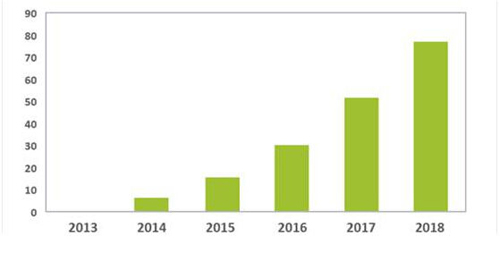 图一、2014-2018年全球穿戴式装置电池产值预测(单位:百万美元)