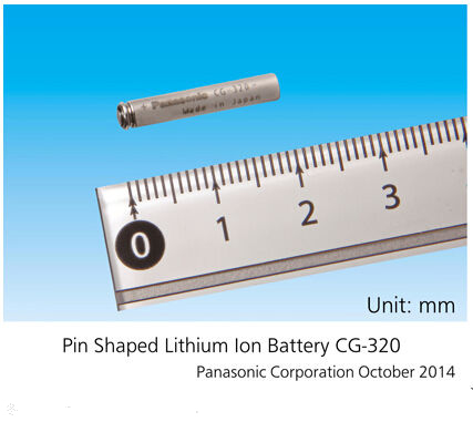 日本大厂松下(Panasonic)不仅是电动车动力锂电池的主要供货商,在3C锂电池这块当然不能缺席。Panasonic利用在信息及通讯装置上所使用的电池材料技术,以及参考钮扣型电池与其他小型锂电池的制造技术,开发出 市场上最小的别针造型锂离子电池CG-320,直径只有3.5mm,高度约2公分,重约0.6公克,体积约是AAA电池的1/20,容量为13mAh。
