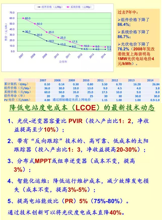 关于光伏组件和光伏系统成本下降情况,发改委能源研究所局研究员王斯成也在上述会议上提供了一些信息如下图所示。